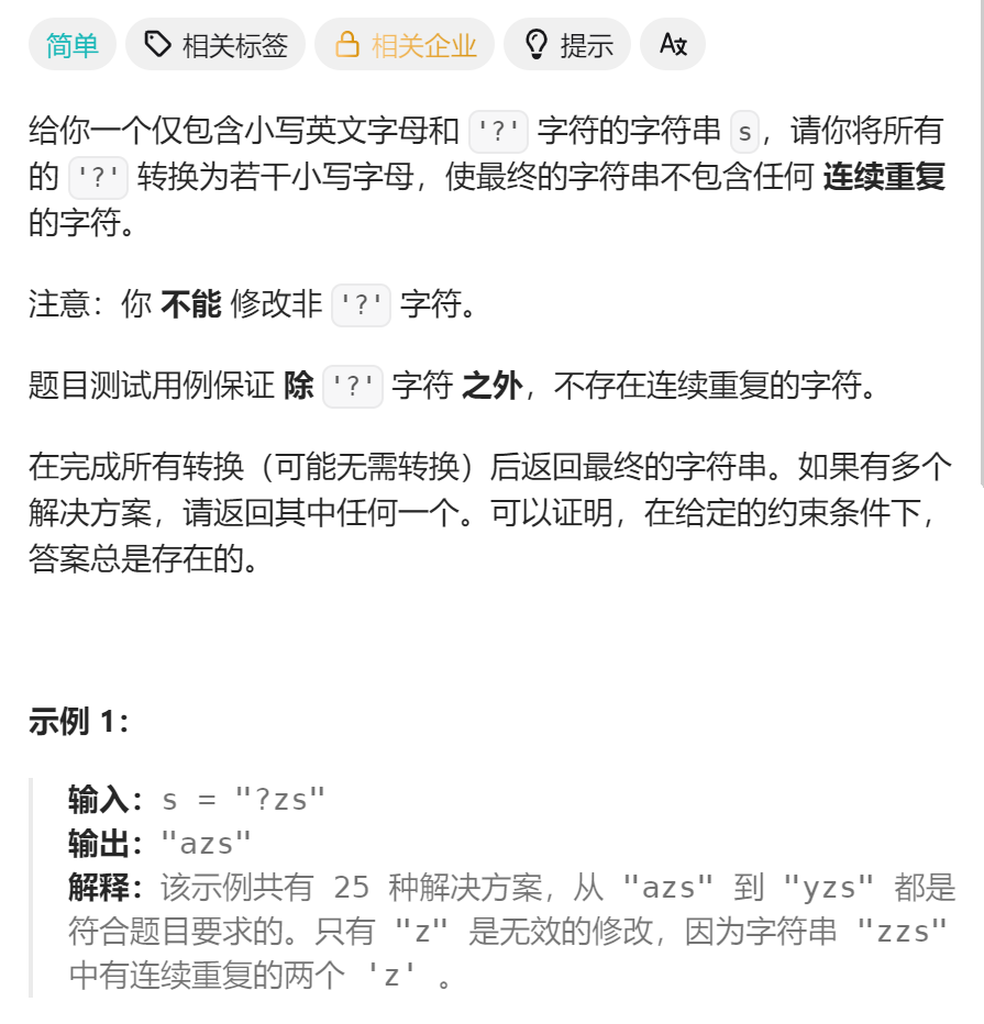 【遇到?将?替换为前面位置和后面位置都没有的字符,这样就不会出现连续重复的字符串】我们在遇到?之后,需要找一个字符放进来,遍历a到z,这个字符不能等于?前面的字符,也不能等于?后面的字符。