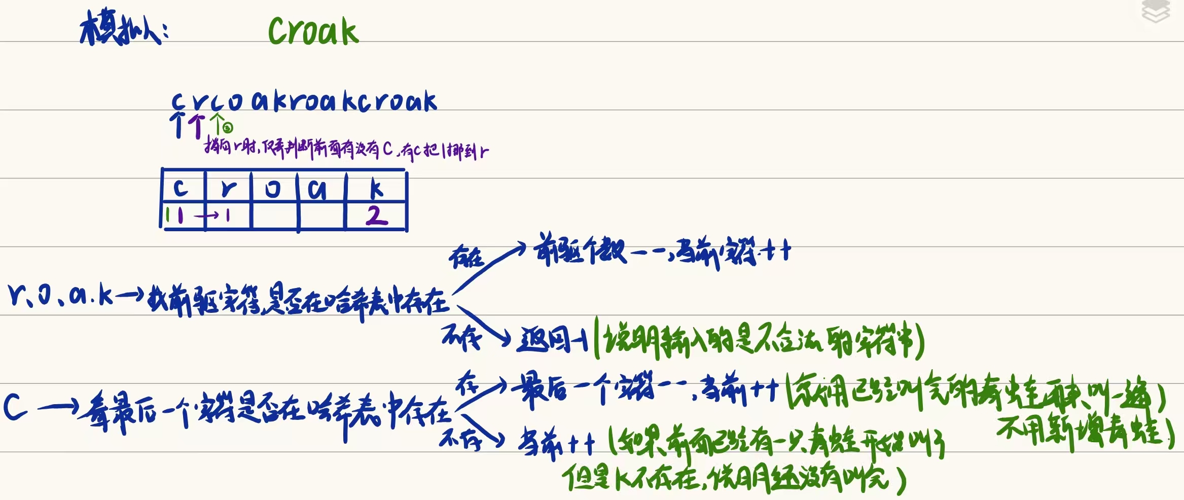 指向c的时候,c+1,指向r的时候,看哈希表里面有没有c,有c就给r+1, c-1,当再次指向c的时候,发现哈希表里面没有c就给c+1,然后走到o就要看前面有没有r,有r就将o+1,r-1.直到走到k。两个都走到k的时候k=2,当再次出现c的时候,此时就让k-1,c+1,就不需要第三只青蛙了。