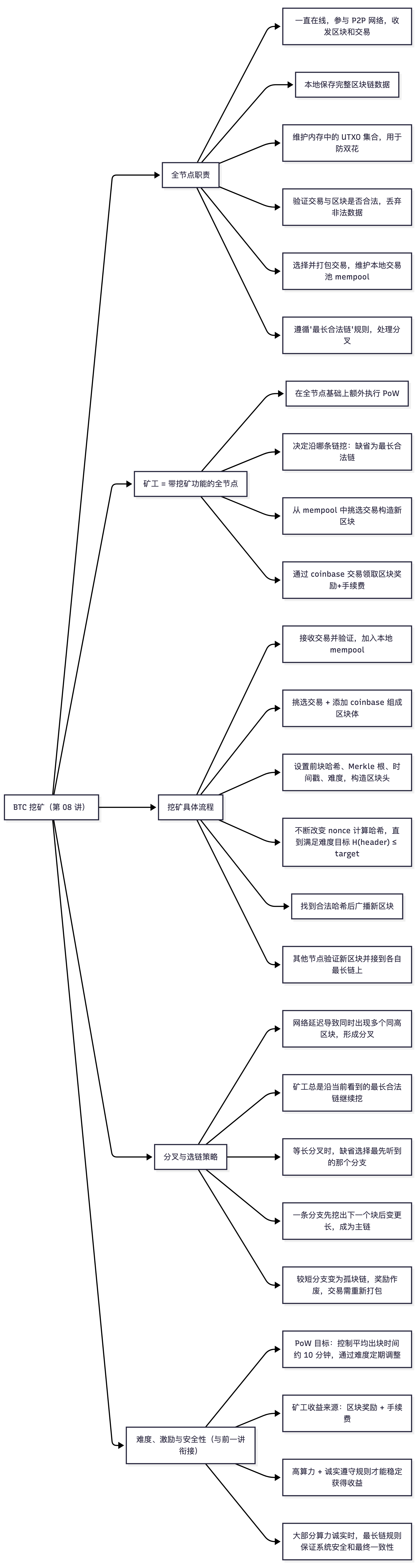 可以把整个第 08 讲"BTC 挖矿"总结为下面的结构: