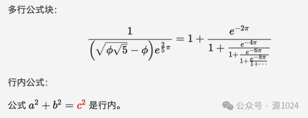 数学公式:数学公式块、行级数学公式,通过 MathJax 和 KaTeX 支持