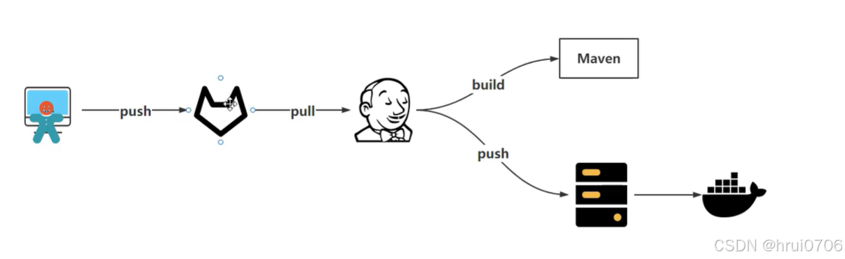 开发将代码上传到git,Jenkins拉去代码通过Maven构建(可以完成测试),然后推送到生产,生产通过docker部署完成