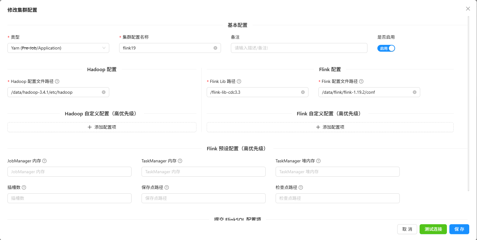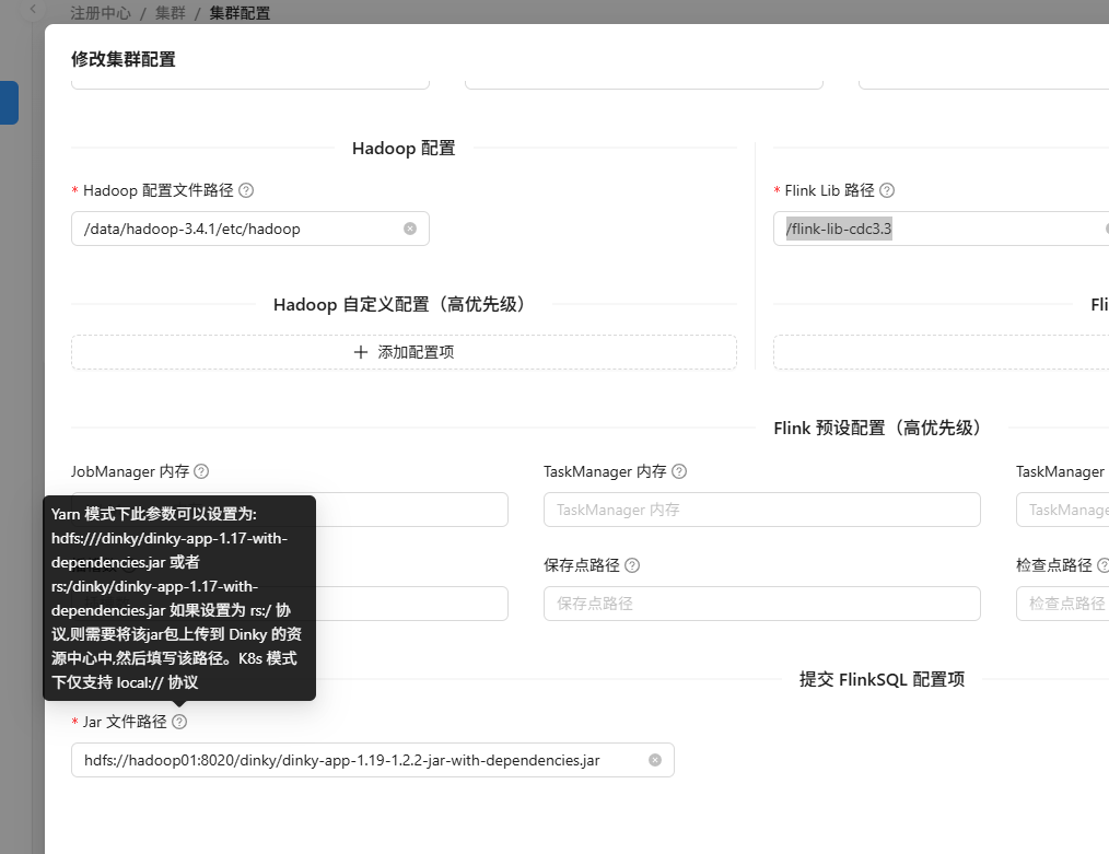 在这儿填写Fink Lib路径为刚刚在hdfs中创建好的路径 /flink-lib-cdc3.3