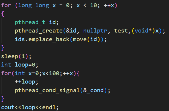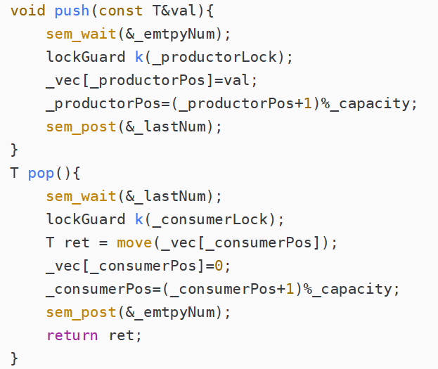 这里有注意事项,push的sem_post必须写在末尾,原因是你先post,那么_emptyNum就会++,那么就可能导致在pop那直接进入拿取值,但此时可能push还没有把值加入进去,就导致拿取了垃圾数据,就出了问题。