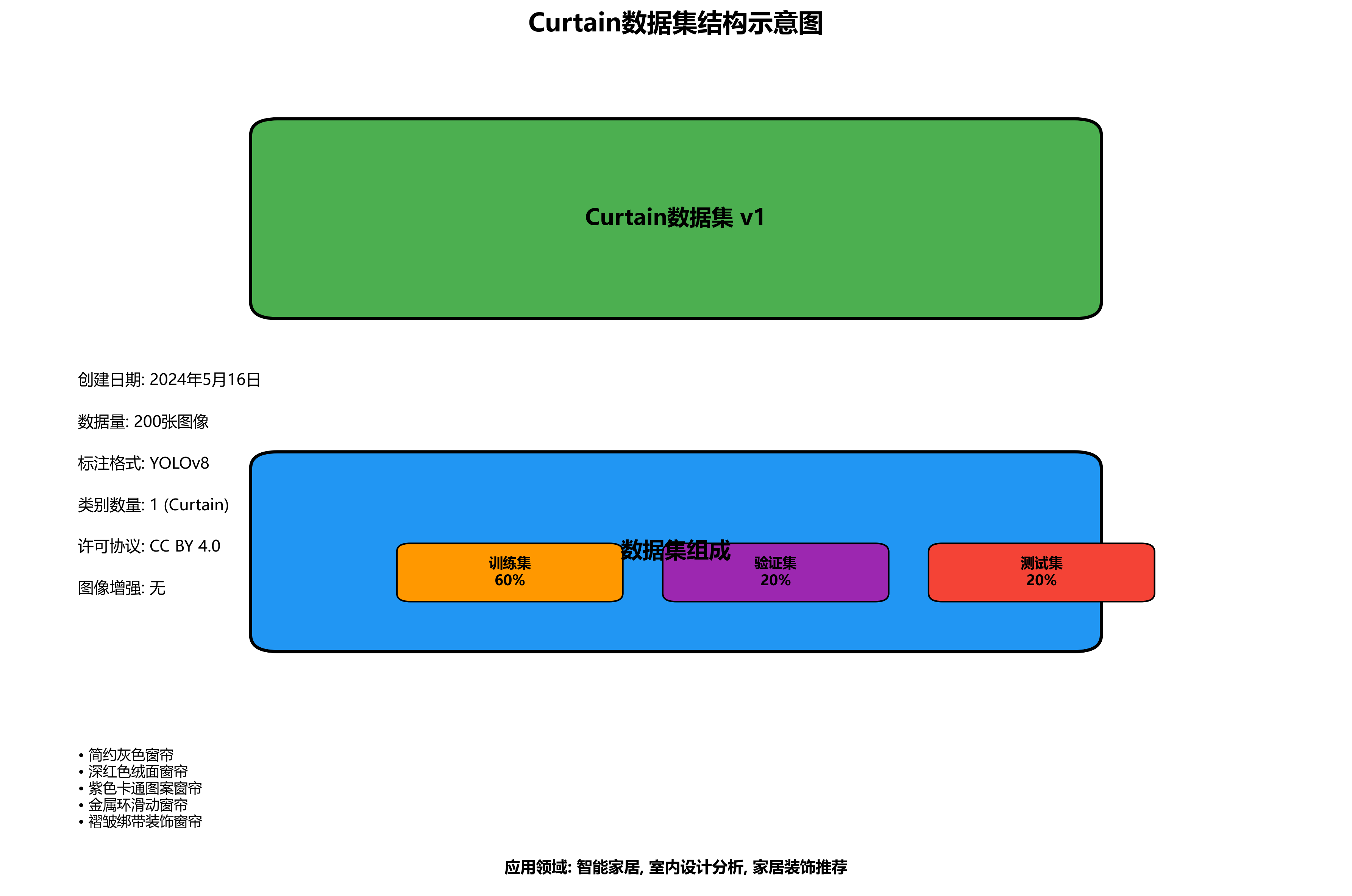 本数据集名为Curtain,版本为v1,创建于2024年5月16日,由qunshankj用户提供,遵循CC BY 4.0许可协议。该数据集共包含200张图像,所有图像均采用YOLOv8格式进行标注,专注于窗帘类别的目标检测任务。数据集的图像来源多样,涵盖了不同风格、材质和颜色的窗帘在各种室内环境中的展示情况,包括简约灰色窗帘、深红色绒面窗帘、紫色卡通图案窗帘等多种类型。从图像内容分析,窗帘的安装方式多样,有的采用金属环设计便于滑动,有的通过褶皱和绑带形成装饰性效果,展现了窗帘在居家环境中的多功能性。数据集的训练、验证和测试集分别存储在对应的图像文件夹中,类别数量(nc)为1,类别名称为'Curtain'。值得注意的是,数据集在预处理过程中未应用任何图像增强技术,保持了原始图像的特性,这有助于研究窗帘在不同光照条件、背景环境下的表现特征。该数据集可用于训练和开发基于深度学习的窗帘检测模型,为智能家居、室内设计分析以及家居装饰推荐等领域提供技术支持。