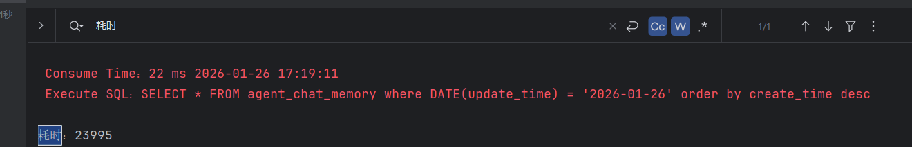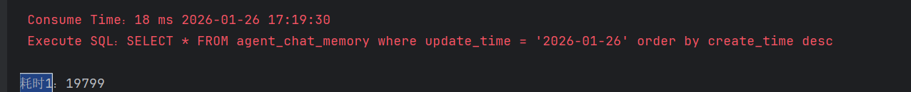 "SELECT * FROM agent_chat_memory where update_time = '2026-01-26' order by create_time desc");