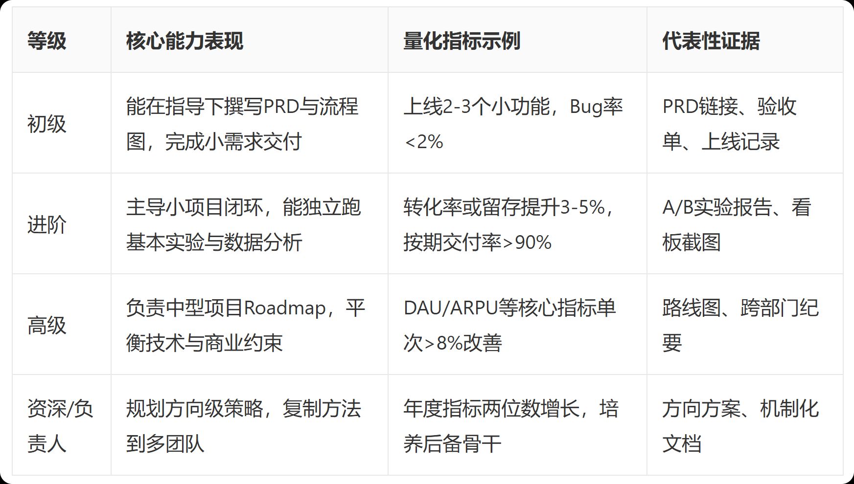 为便于自诊与阶段对比,建立一张能力-等级的结构化表格。你可以按"初级、进阶、高级、资深/负责人"四级定义每项能力的行为与产出阈值,并配置量化KPI与代表性证据。表格化的标准既利于自我校准,也方便与招聘方或导师沟通成长计划。下面给出一个可参考的对比表: