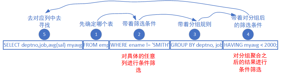 - SELECT(选列):从剩下的小组里,只提取 "部门、岗位、平均工资" 这三列(并把平均工资命名为 myavg)------ 这一步才是 "选择要展示的内容";