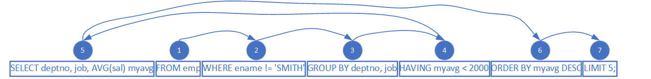 例子:SMITH员工不参与统计,显示平均工资低于2000的部门和它的平均工资,按平均分 myavg 降序排序,只取前 5 条结果