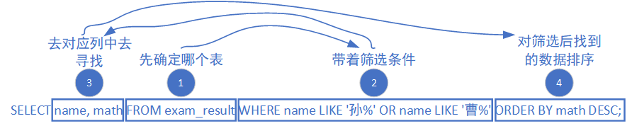 - FROM(找数据源):先找到公司的员工花名册(emp 表)------ 第一步必须先有数据来源;