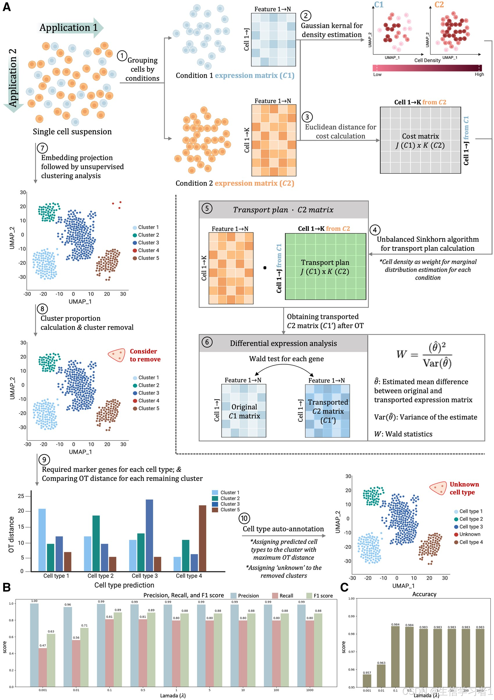 为解决上述挑战,我们引入了 OTMODE 这一基于 Python 的框架,该框架利用最优传输(OT)理论来检测单细胞数据中的差异特征,并提高注释的准确性。OT 理论提供了一种基于原则的方法来比较概率分布,通过找到将一个分布转换为另一个分布的最有效方式来实现。这使得 OT 特别适合单细胞数据分析,因为它自然地处理了固有的稀疏性,通过关注分布的实际支持而非要求在整个特征空间中进行密集表示而无需特定于维度的假设。此外,OT 的强大泛化能力使其能够轻松扩展到高维空间,而无需特定于维度的假设(阿尔特舒勒等人,2017 年;吉内瓦伊等人,2018 年;韦德和巴赫,2019 年),使其非常适合应用于通常包含数万个特征的现代单细胞数据集。由于 OT 的几何特性保留了高维数据的内在结构,其捕捉复杂分布差异的能力使其非常适合单细胞测量的异质性。