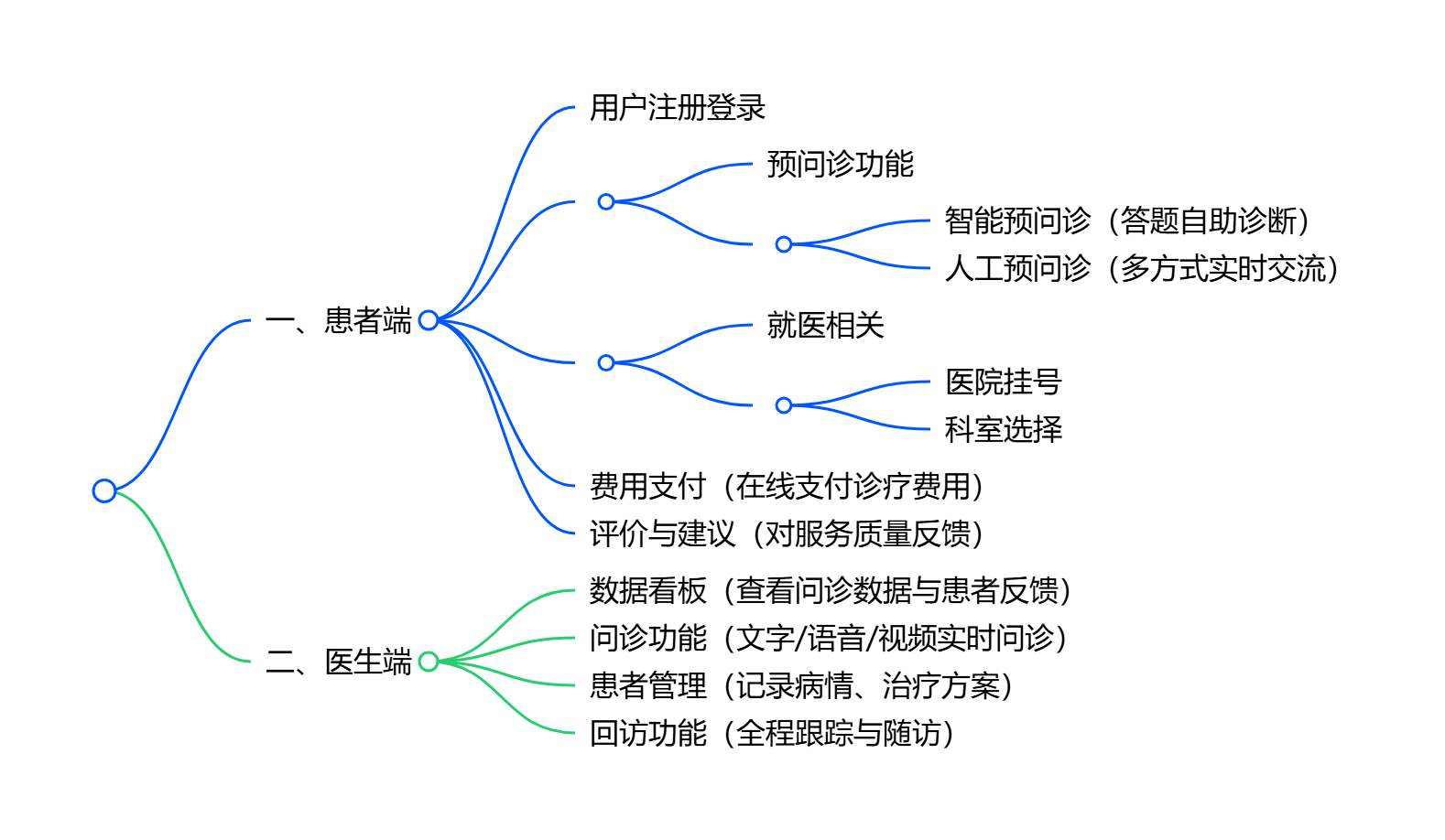 - 患者端:支持注册登录,可选择智能或人工预问诊(多种方式传递病情),能进行医院挂号、科室选择、在线费用支付,还可对服务进行评价与提建议。