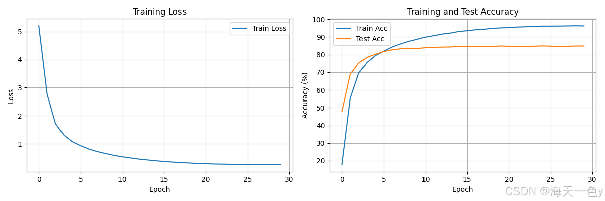 Epoch 30/30: Train Loss: 0.2563, Train Acc: 96.24%, Test Acc: 84.88%, Best Acc: 84.93%, Time: 426.17s