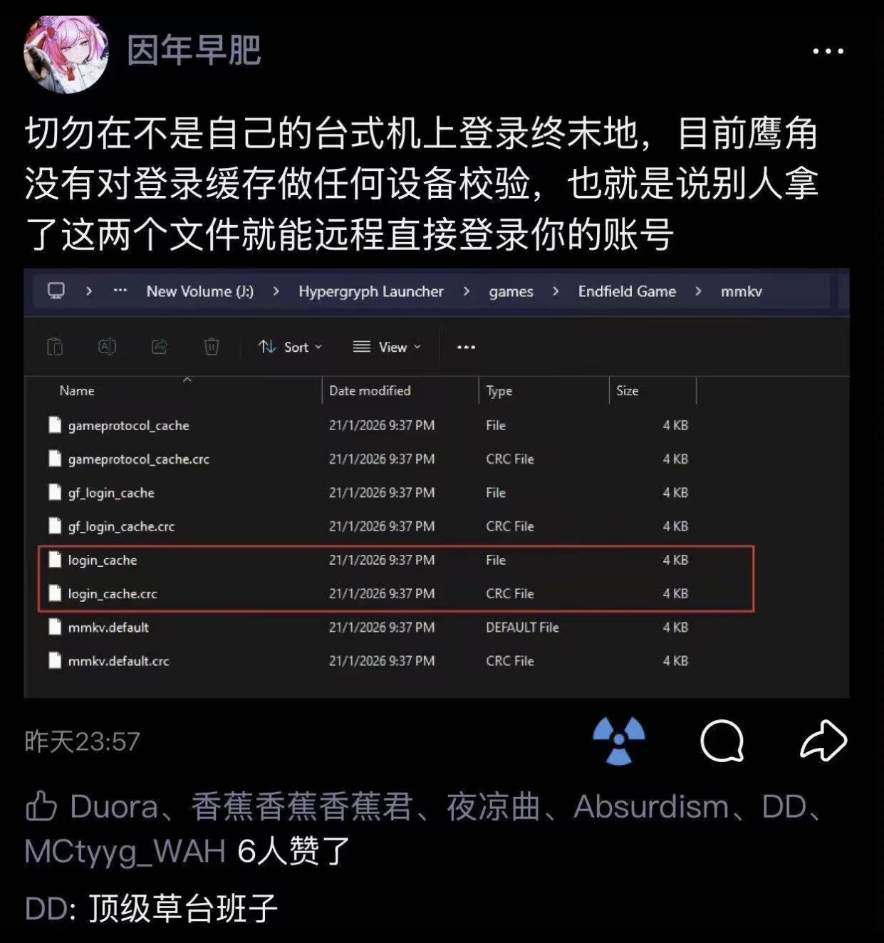 有传言称,鹰角没有对登录缓存做严格的设备指纹校验。这意味着,如果黑客或者别有用心的人,获取了玩家 A 电脑上的登录凭证文件(通常是 JSON 或加密的二进制文件),将其复制到玩家 B 的电脑上,就可以直接绕过密码验证登录玩家 A 的账号。