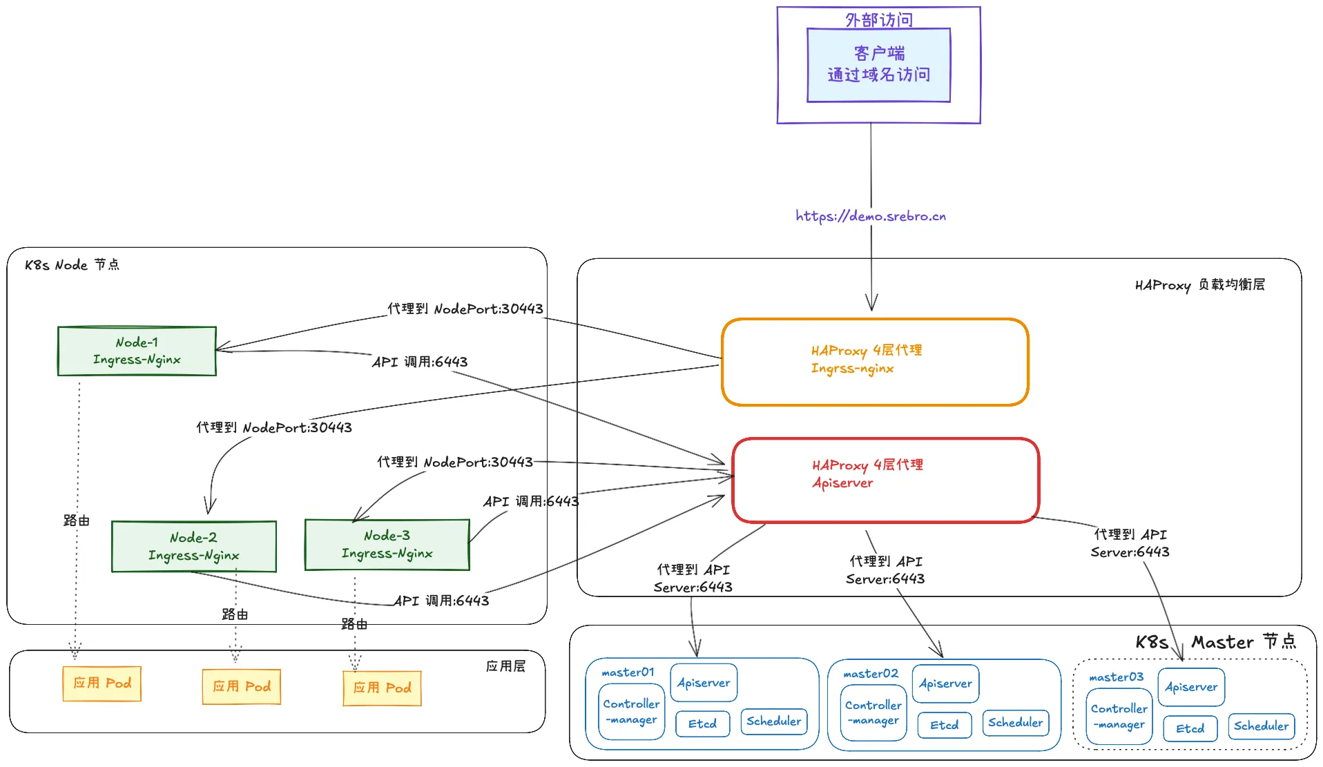 HAProxy 监听本地的 443 端口,并代理到 所有node 节点上的 Nodeport 端口上。