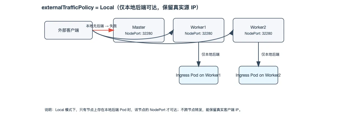 - 策略选择:externalTrafficPolicy=Cluster:任意节点可达,易用但一般不保留真实 IP(跨节点转发+SNAT),externalTrafficPolicy=Local:仅本地后端节点可达,保留源 IP;入口节点必须有 Ingress Pod。