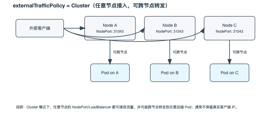 - Cluster(默认):集群内访问会负载到任意就绪后端,可跨节点。