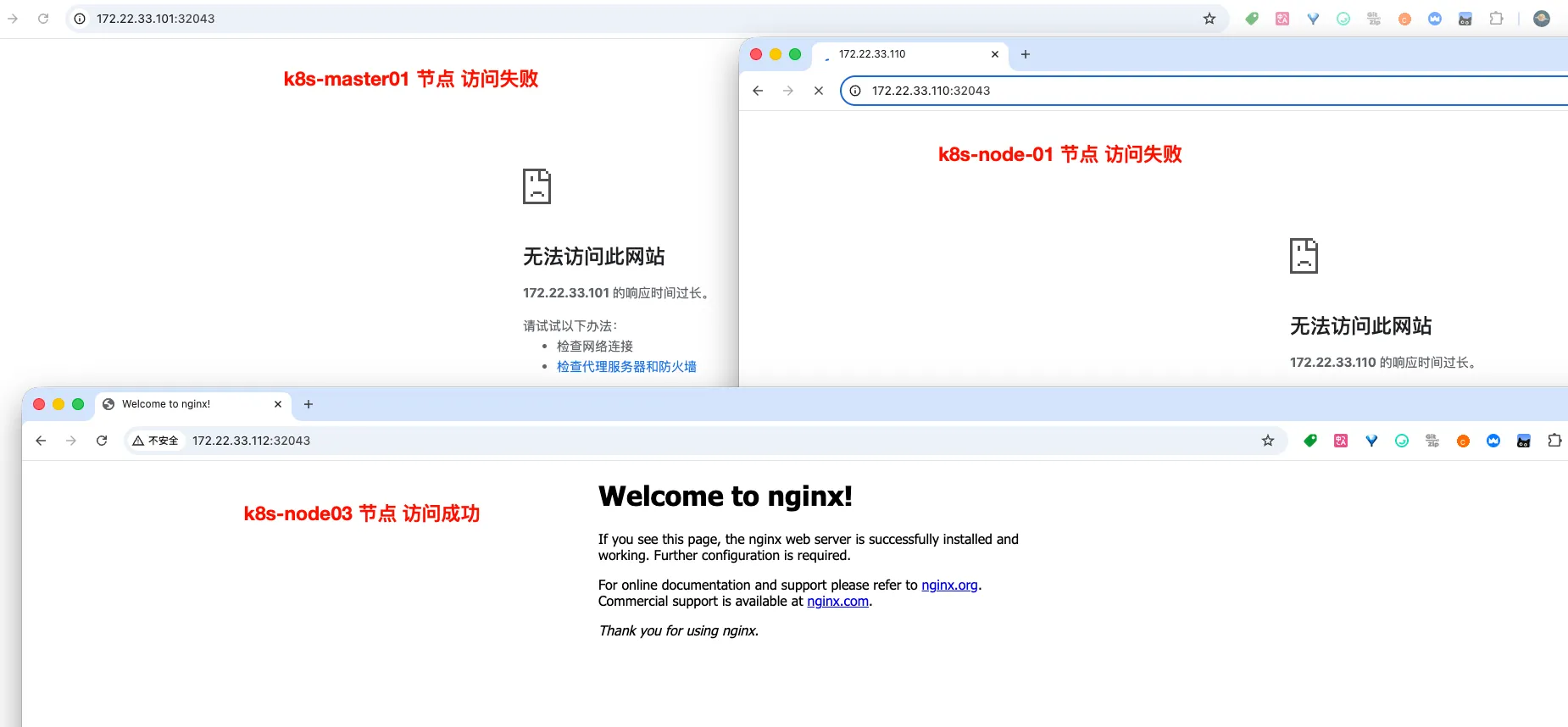 看到 nginx-1 这个 pod 运行在 k8s-node3 节点上,我们试下用不同的节点访问,看下对比的效果