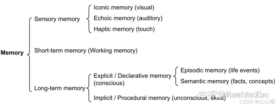 感觉记忆: 这是记忆的最早阶段,能够在原始刺激结束后保留感官信息(视觉、听觉等)的印象。短期记忆(STM) 以及长期记忆(LTM)。