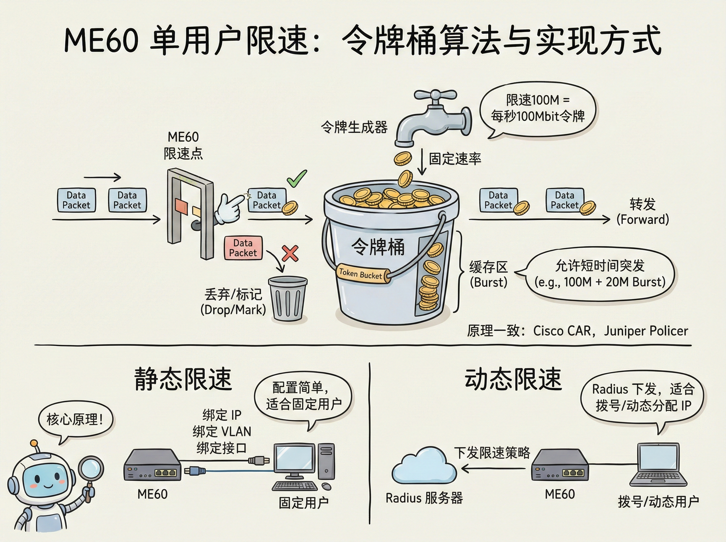 ME60的单用户限速基于令牌桶算法,这是当前主流的流量整形和限速算法,和思科的CAR、Juniper的Policer原理一致。