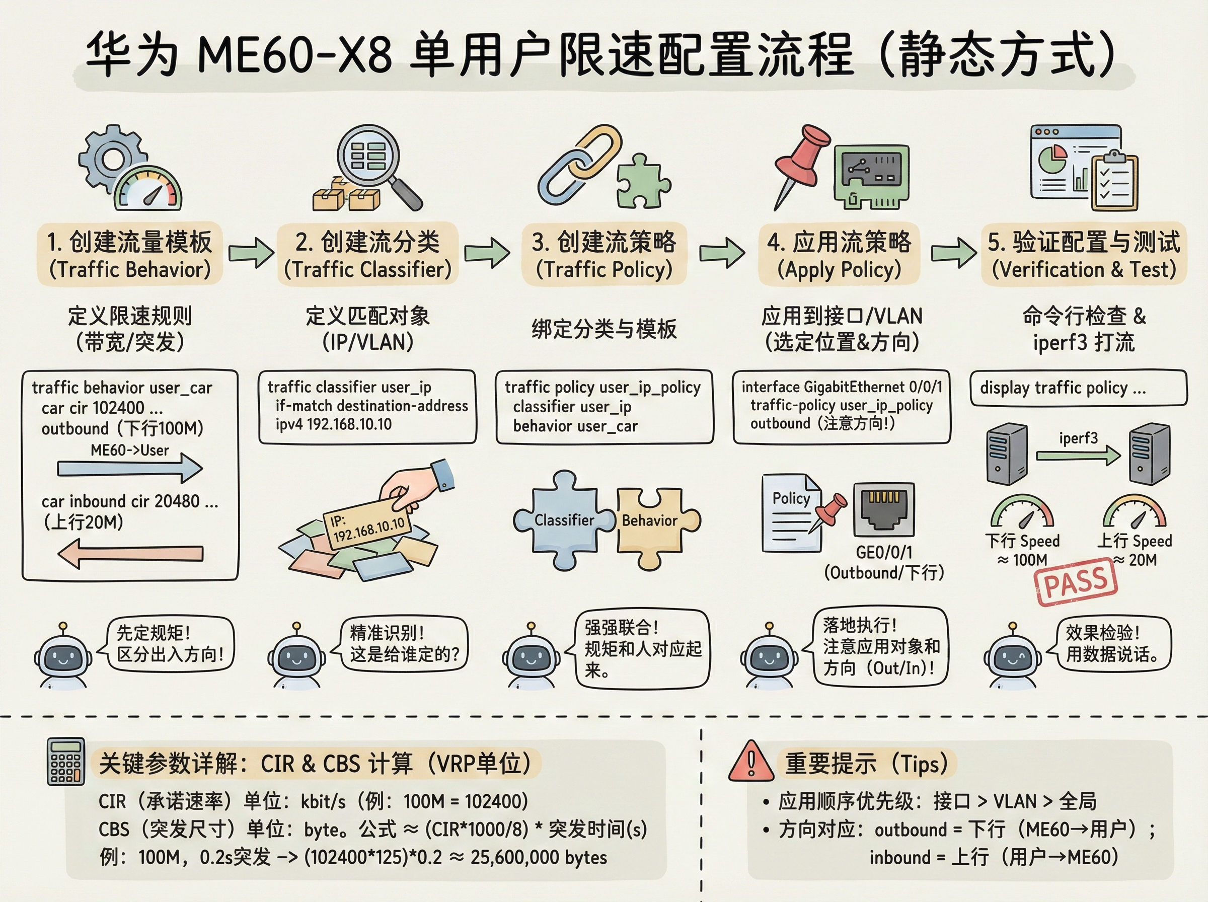 cir:承诺信息速率,单位是kbit/s,100M=102400kbit/scbs:承诺突发尺寸,单位是byte,计算公式是cir * 250(因为令牌桶默认每4ms生成一次令牌,2504ms=1s),100M的cbs就是102400 1000/8 * 0.25=3200000byte?不对,这里要注意VRP的单位:cir是kbit/s,cbs是byte,所以正确的计算是(cir * 1000 / 8) * 突发时间,比如突发时间200ms,就是(102400*1000/8)*0.2=25600000byte,和上面的配置一致green/yellow/red:三色标记的动作,pass是转发,discard是丢弃,也可以配置remark dscp标记DSCP值,后续配合QoS队列调度