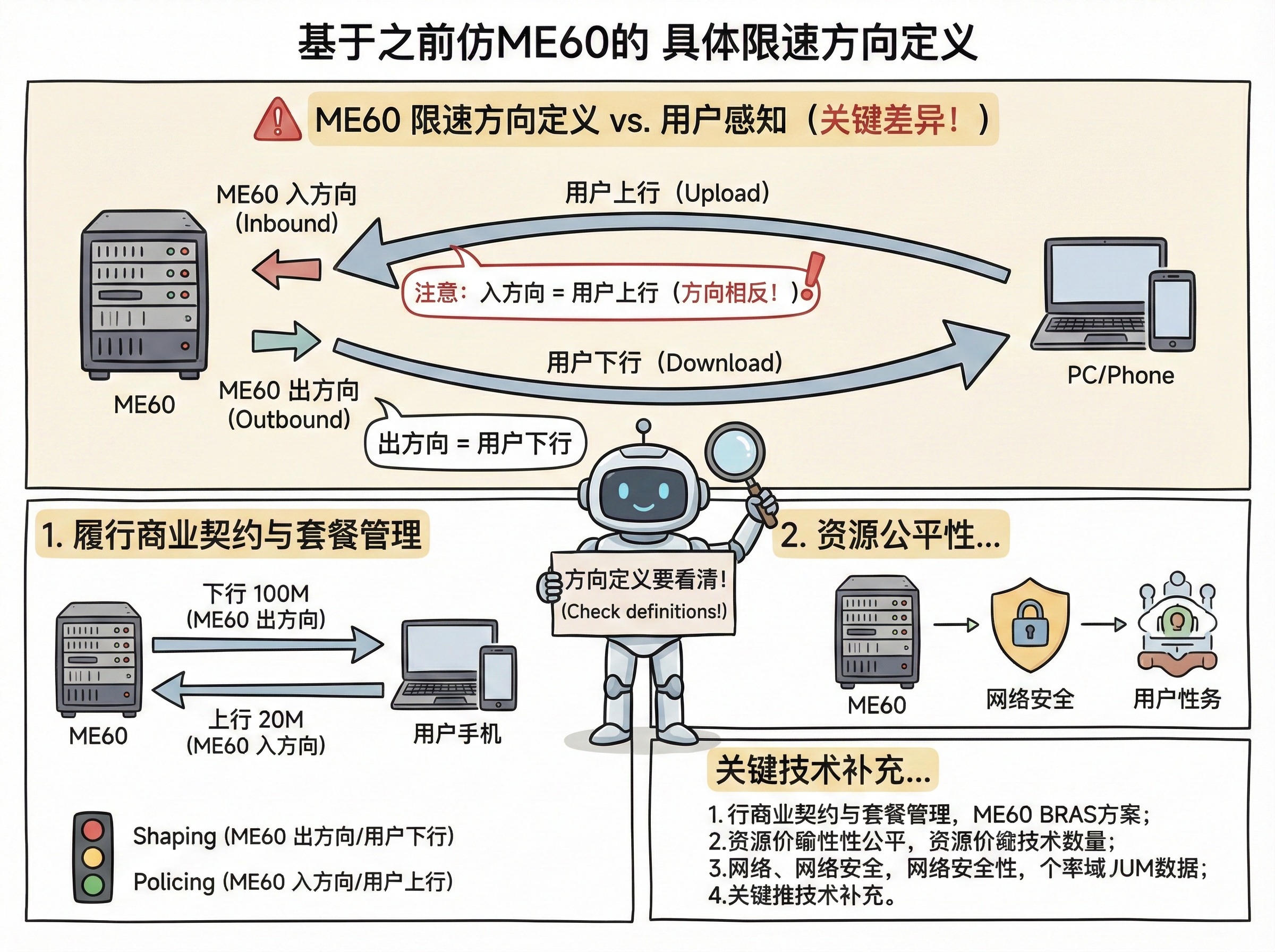 之前有次给某政企客户做专线迁移,没注意ME60的限速方向,把上行限速配成了下行,结果客户的VPN业务直接卡成狗,排查了2小时才找到问题。这里要明确:ME60的限速方向是针对设备自身的,入方向(inbound)是用户到ME60的流量,出方向(outbound)是ME60到用户的流量,和用户感知的上下行是反过来的------比如用户的下行带宽对应ME60的出方向限速。