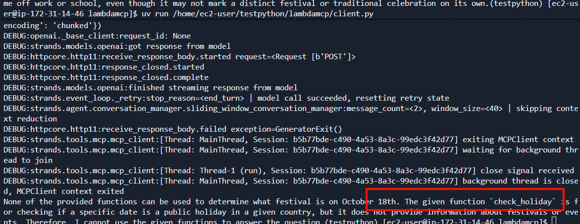 检查发现FastMCP 实际上提供了一个关键的参数:stateless_http 。在 Lambda 这种无状态的环境中,默认的有状态(Stateful)SSE 会因为找不到 sessionId 而崩溃。要解决 Session not found 错误,需要在 mcp.run 中开启 无状态模式 ,明确指定 stateless_http=True