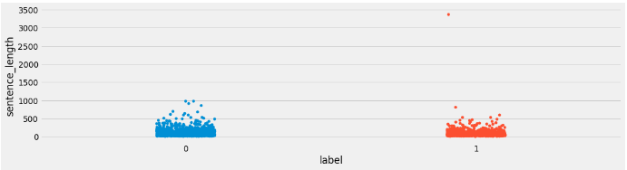 通过查看正负样本长度散点图, 可以有效定位异常点的出现位置, 帮助我们更准确进行人工语料审查. 上图中在训练集正样本中出现了异常点, 它的句子长度近3500左右, 需要我们人工审查.