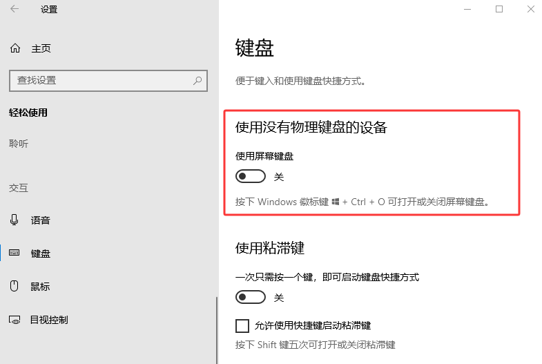 > 路径2 :打开「开始菜单 」->进入「设置 」->选择「轻松使用 」/「辅助功能 」->「键盘 」->启用底部的「屏幕键盘」;