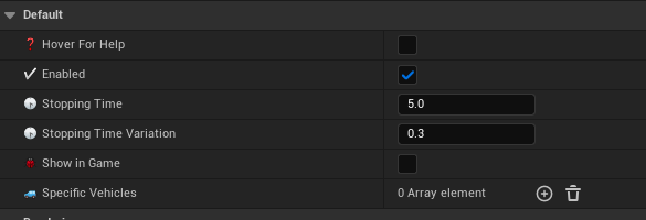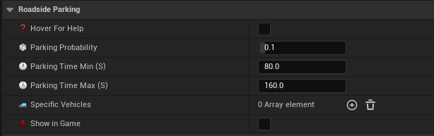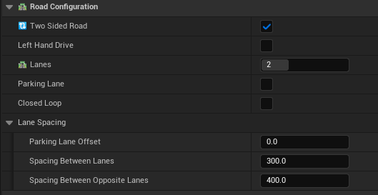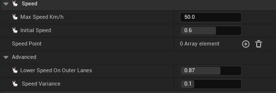 - 正常情况下,这里不需要改动,交由BP_Vehicle_Manager蓝图来管理;如果想要为这条道路设置特殊性,可以调整这里的车辆