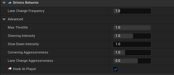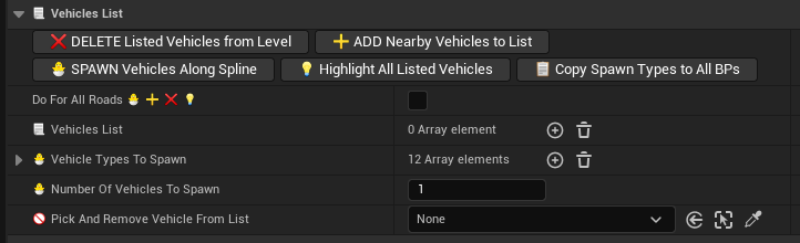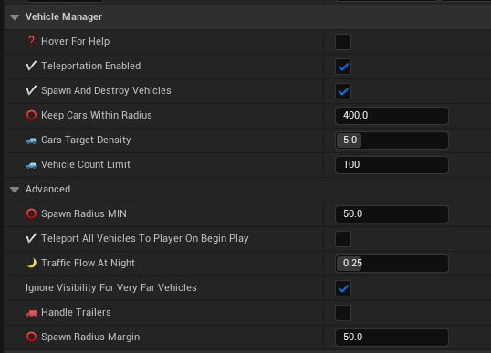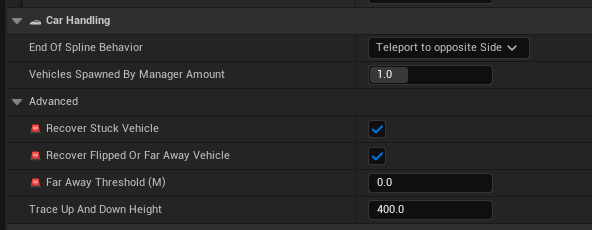 - Vehicles Spawned By Manager Amount:由管理器生成的车辆数量【由BP_Vehicle_Manager蓝图来管理】