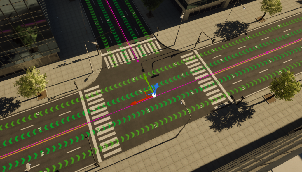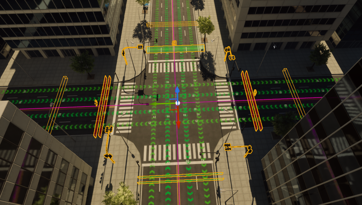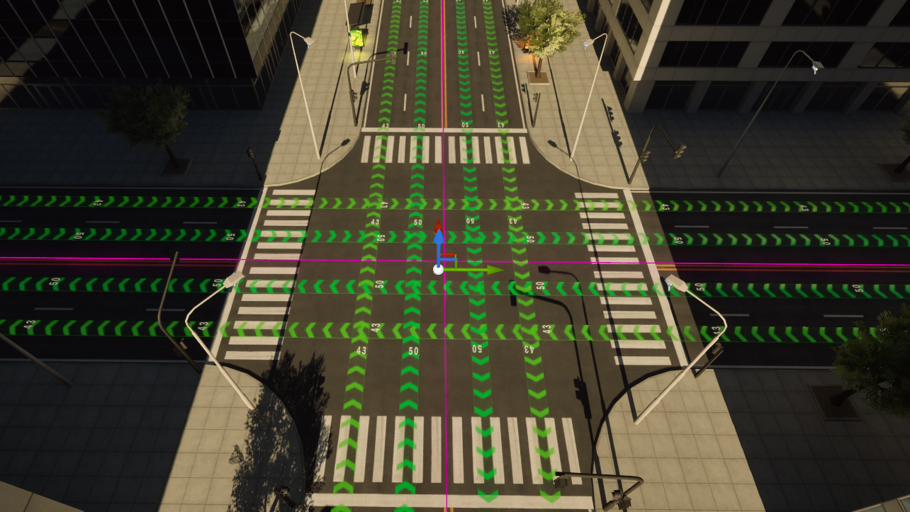 - 加入蓝图后,可以调整3-way,调整T型路口,也可以通过Intersection Entry调整红绿灯的数量,这样就完成了十字路口简单布置