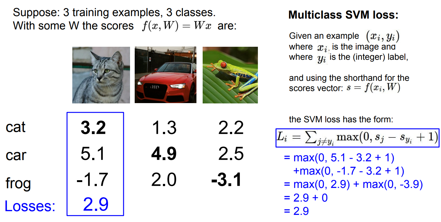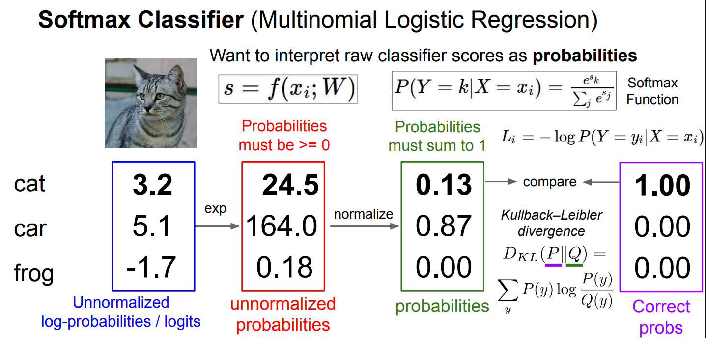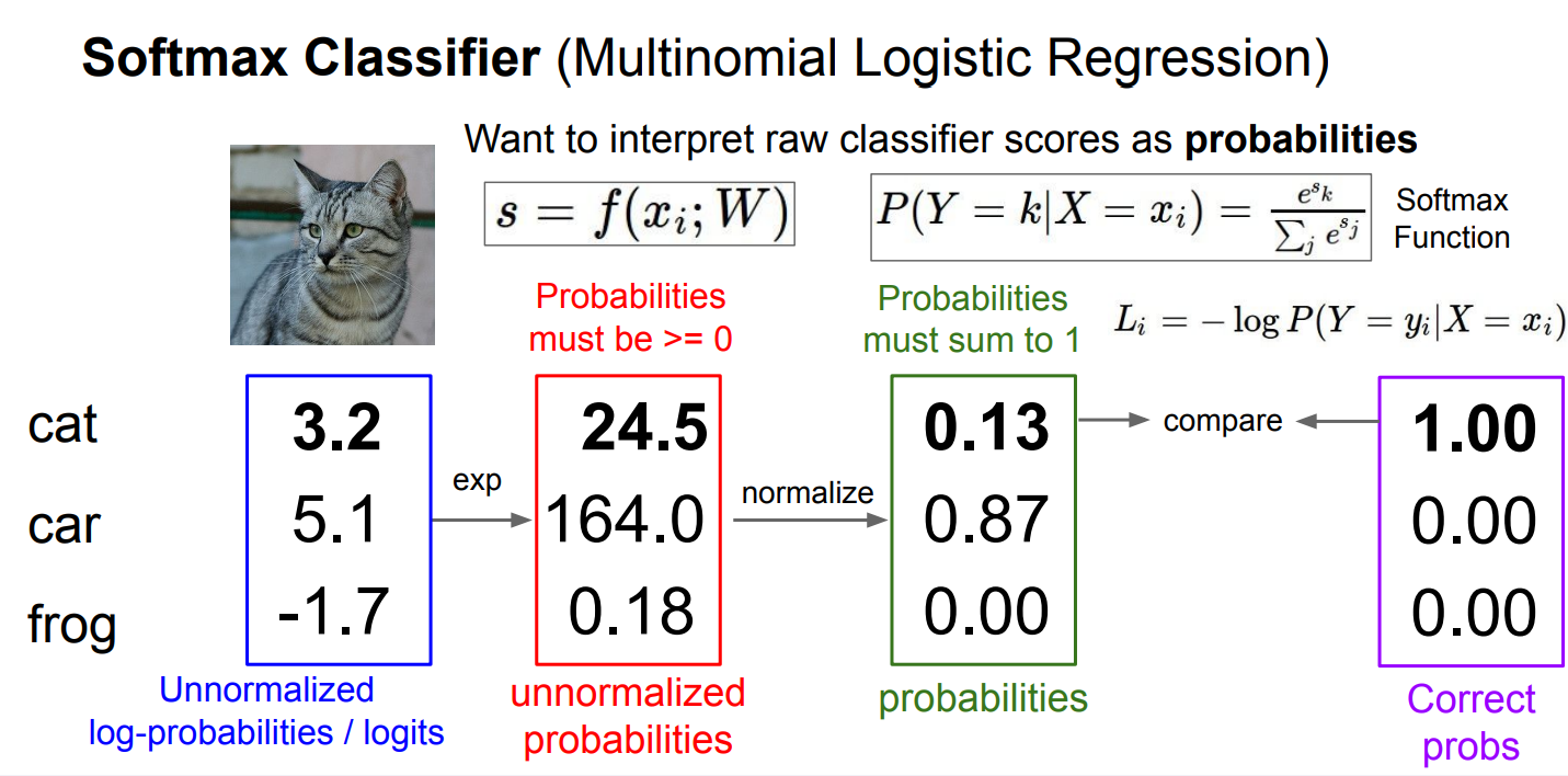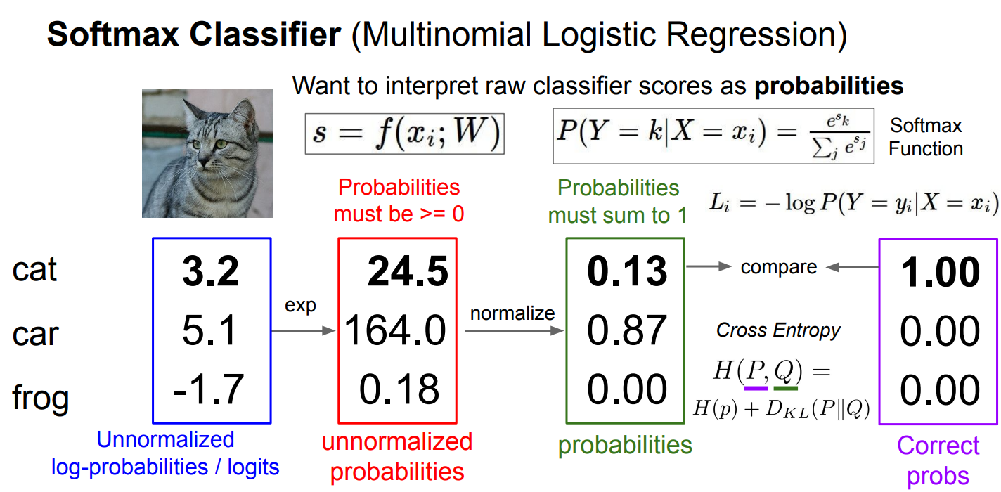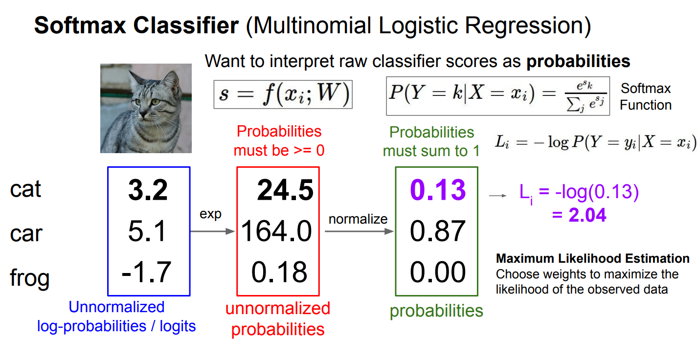 首先模型对输入 x i x_i xi 给出每个类别的原始分数 s = f ( x i ; W ) s=f(x_i;W) s=f(xi;W),这里分别是 cat: (3.2)、car: (5.1)、frog: (-1.7),这些数可以是任意实数,本身不是概率;