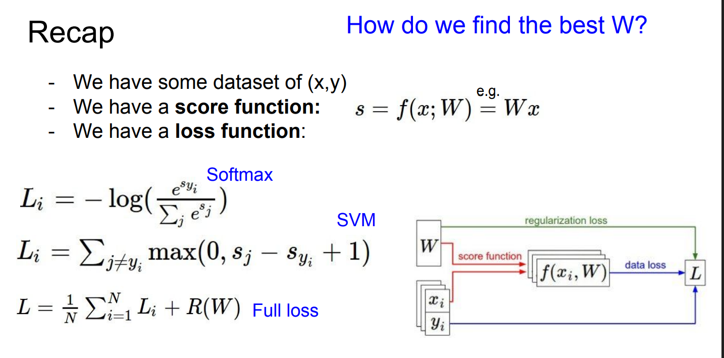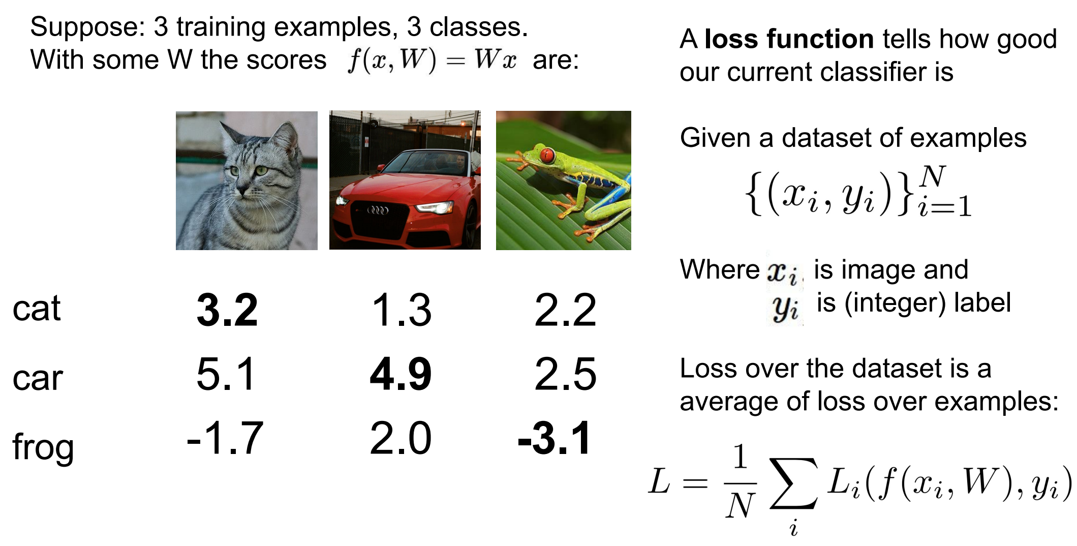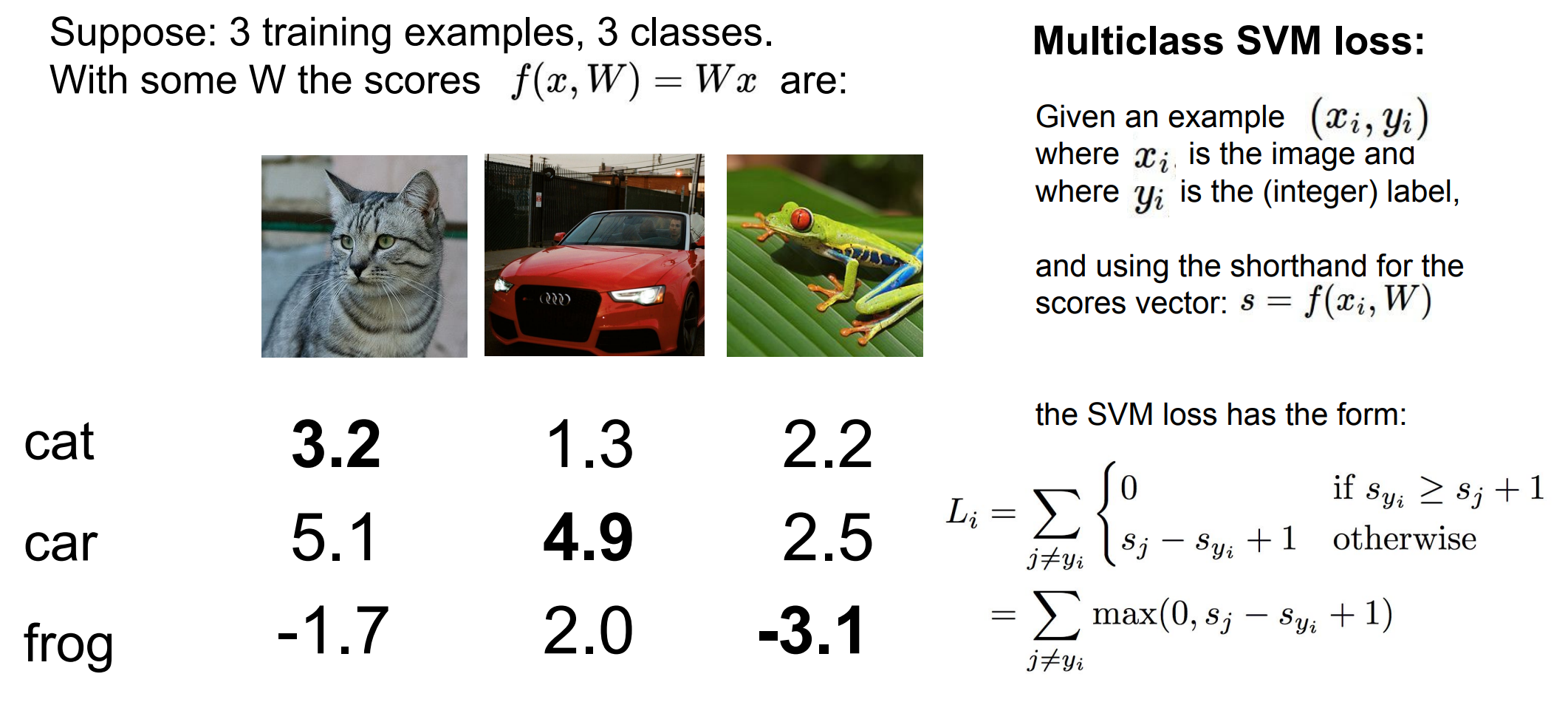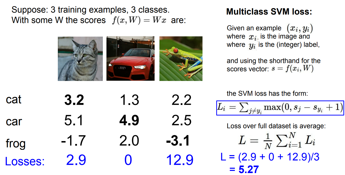 首先模型对输入 x i x_i xi 给出每个类别的原始分数 s = f ( x i ; W ) s=f(x_i;W) s=f(xi;W),这里分别是 cat: (3.2)、car: (5.1)、frog: (-1.7),这些数可以是任意实数,本身不是概率;