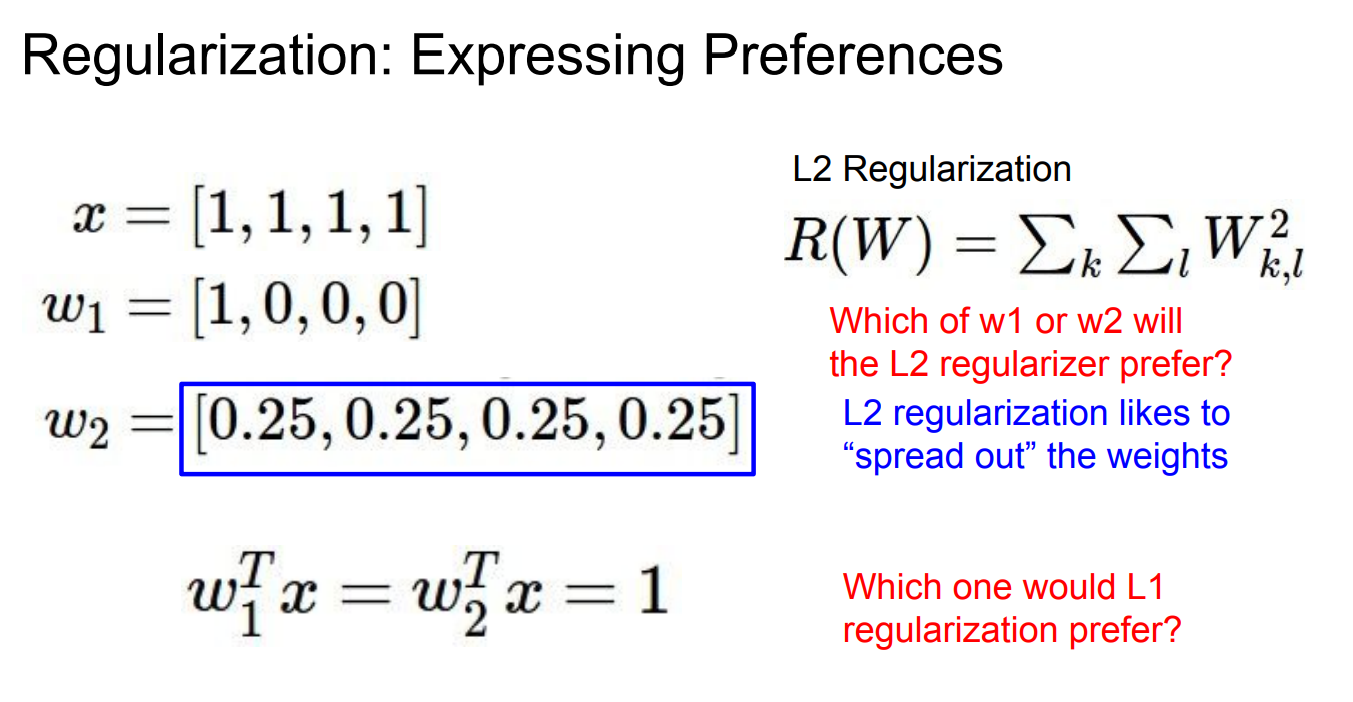 对 L2 正则化 而言,惩罚的是平方范数, ∣ w 1 ∣ 2 2 = 1 |w_1|_2^2=1 ∣w1∣22=1,而 ∣ w 2 ∣ 2 2 = 4 × 0.25 2 = 0.25 |w_2|_2^2=4\times 0.25^2=0.25 ∣w2∣22=4×0.252=0.25,因此 L2 明显更偏好 w 2 w_2 w2,体现了"把权重分散开、避免单个权重过大"的偏好;
