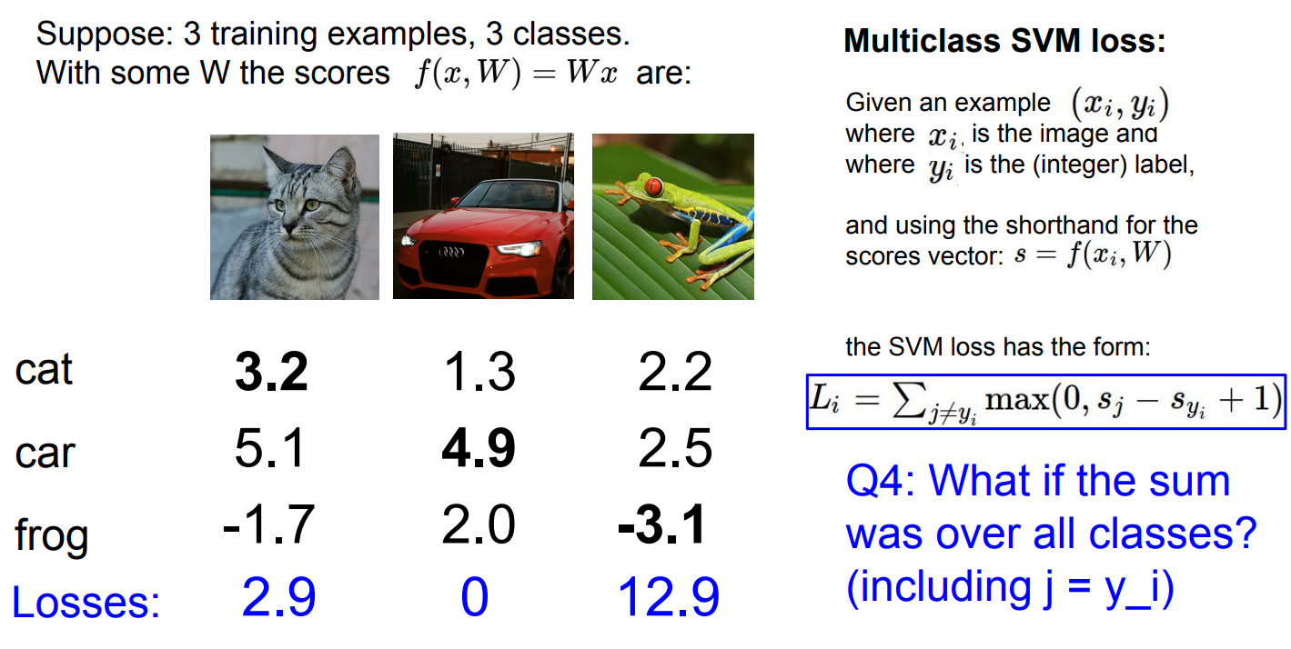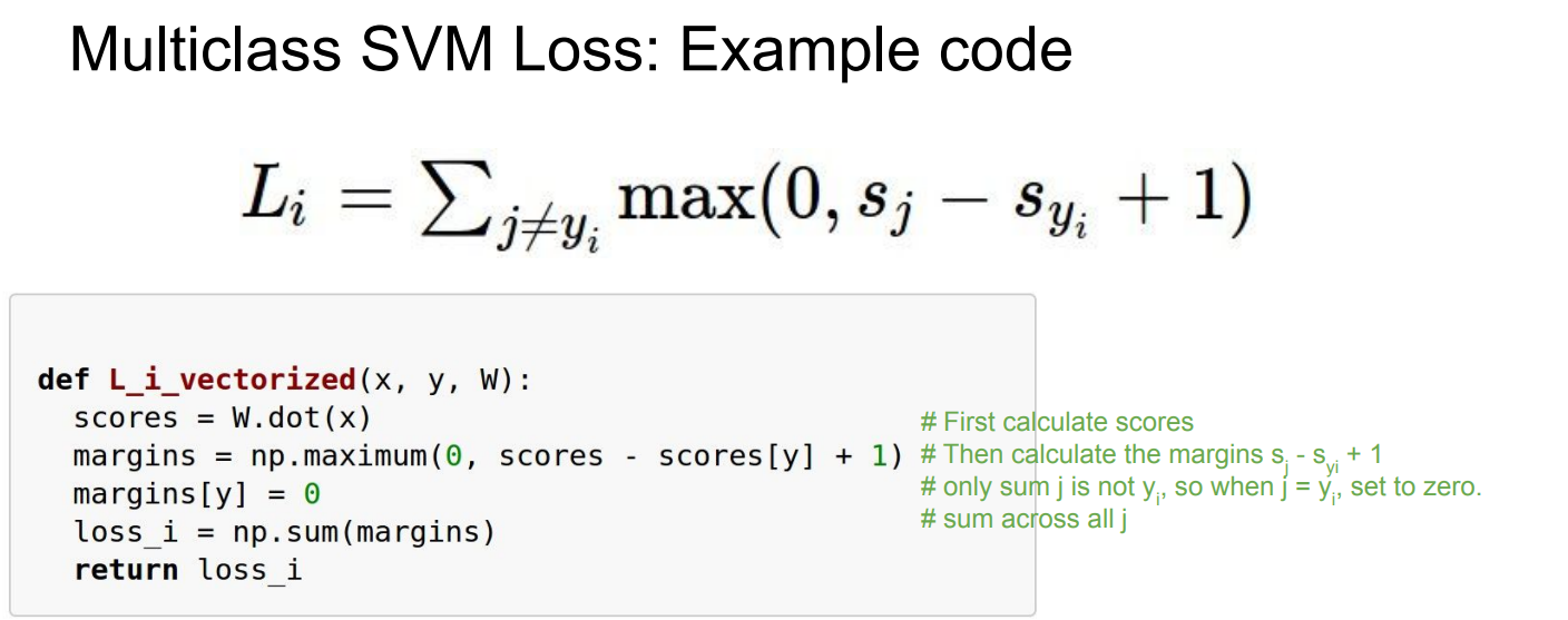 L i = ∑ j ≠ y i max ( 0 , s j − s y i + 1 ) L_i=\sum_{j\neq y_i}\max(0,\; s_j-s_{y_i}+1) Li=j=yi∑max(0,sj−syi+1)