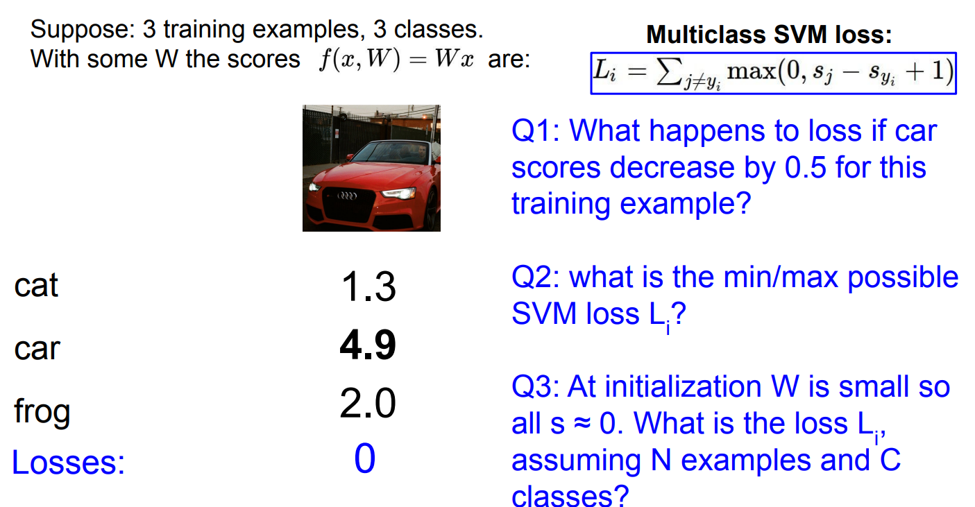Q3: At initialization, W is small, so all s ≈ 0 s \approx 0 s≈0. What is the loss L i L_i Li, assuming N examples and C classes?