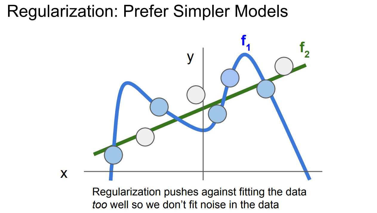 f 2 f_2 f2是一个更简单的模型,它并不精确拟合每一个数据点,而是通过一条平滑的直线尽量简化拟合。这样的模型避免了过度拟合,减少了对数据噪声的敏感性,从而更可能具有更好的泛化能力。
