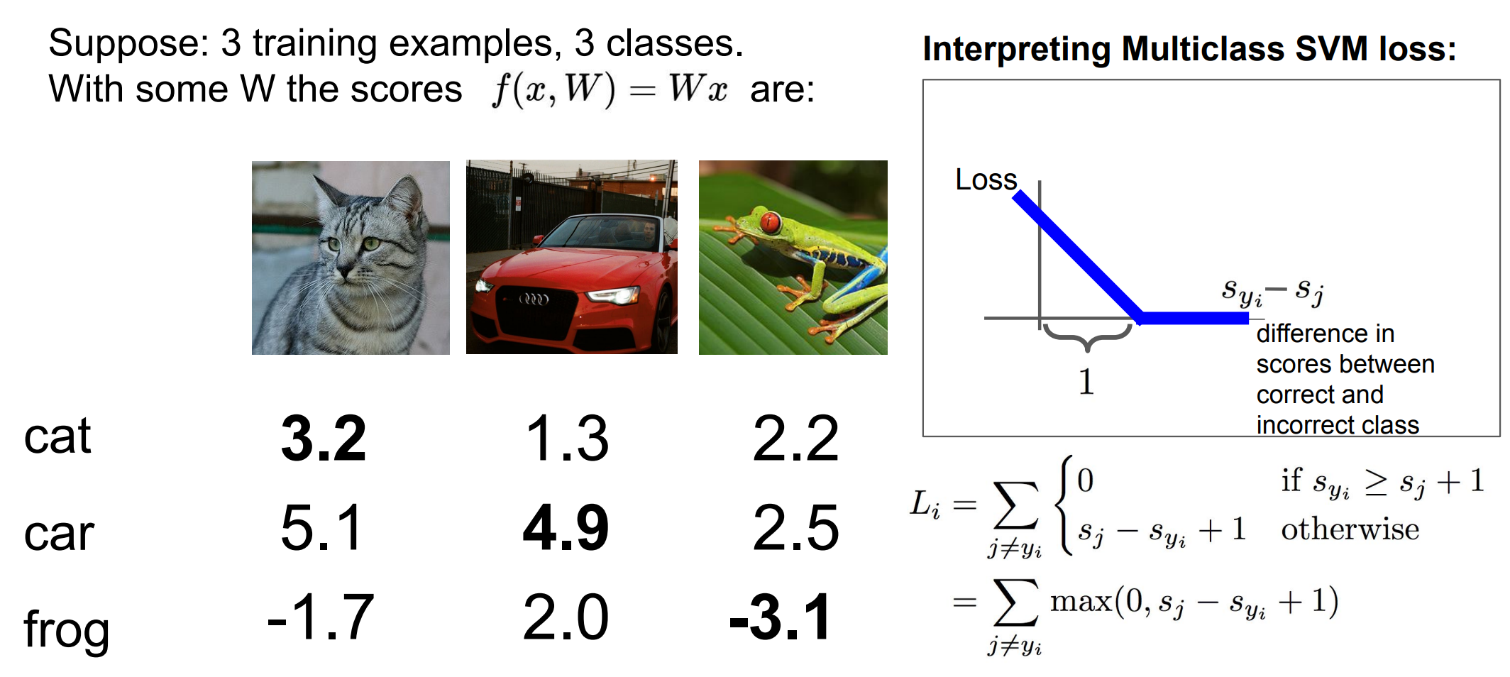 - we want to maximize the difference s j − s y i + 1 s_j - s_{y_i} + 1 sj−syi+1 for each incorrect class j. This would happen if the correct class score is small (near 0) and the other class scores are large.