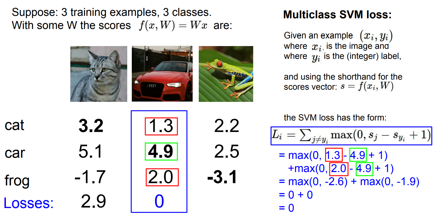 Since both of the incorrect classes (cat and frog) have a loss of 0, the total loss is: