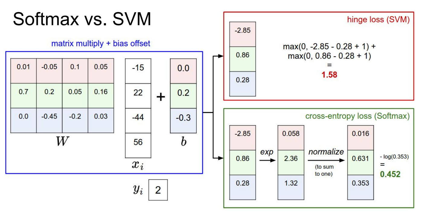 最后如果真实标签是 cat,就取对应概率计算交叉熵损失( L i = − log P ( Y = cat ∣ X = x i ) = − log ( 0.13 ) ≈ 2.04 L_i=-\log P(Y=\text{cat}\mid X=x_i)=-\log(0.13)\approx2.04 Li=−logP(Y=cat∣X=xi)=−log(0.13)≈2.04,