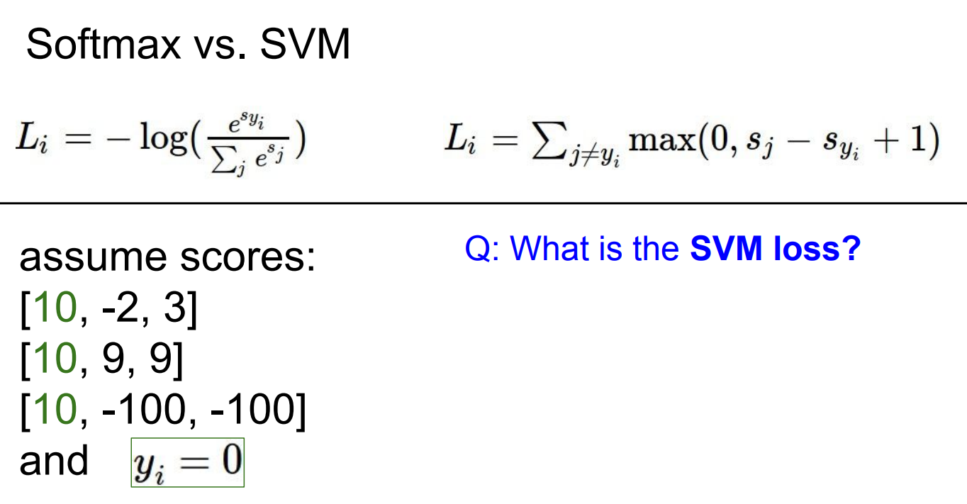 第三组 ([10,-100,-100]),两个错误类的 margin 为 (-100-10+1=-109) 和 (-100-10+1=-109),同样都为 0,loss 还是 0。这个例子清楚地体现了 SVM loss 的特性: