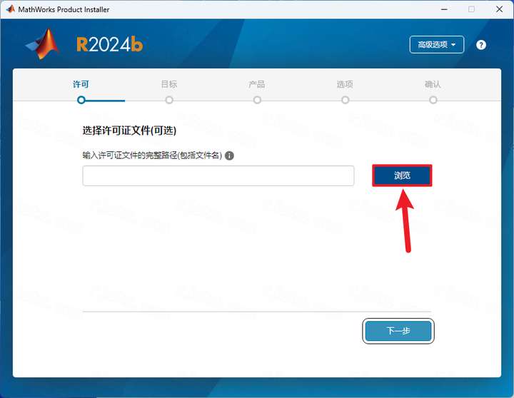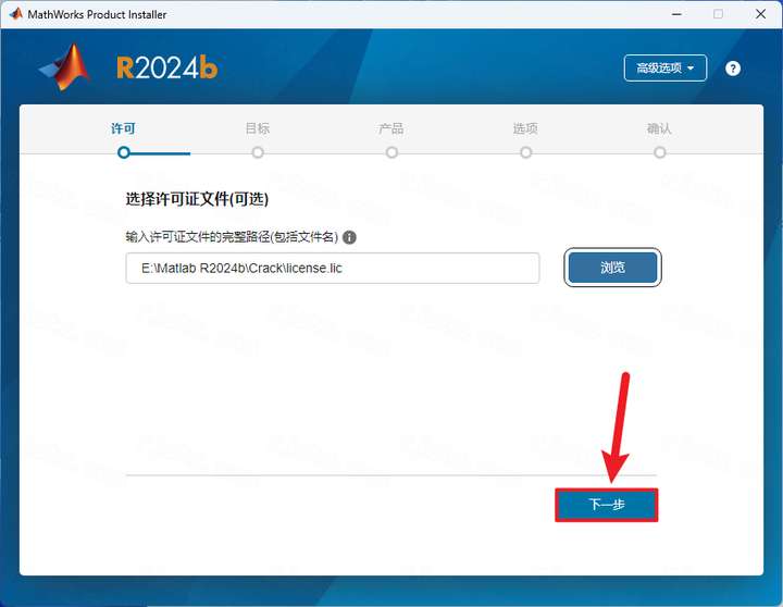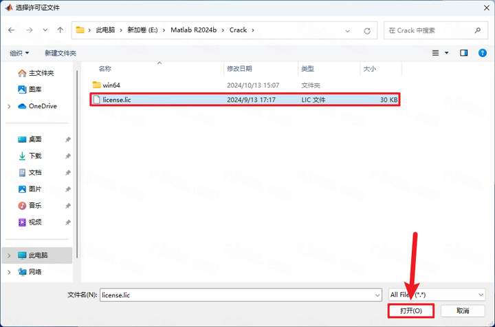8.在跳出的框内找到第2步解压出来的Matlab R2024b win64文件夹,打开里面的【Crack】文件夹,选中【license.lic】文件,打开