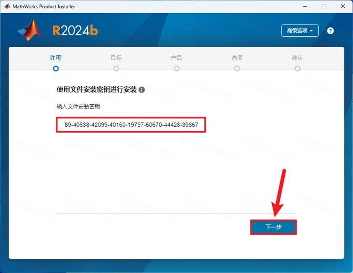 6.输入文件安装秘钥:【39676-02743-14813-63132-22122-21739-42724-01237-08353-51560-41813-30272-46436-42021-53831-05395-21684-43572-58789-40638-42099-40160-19797-60670-44428-39867】,然后点击 【下一步】