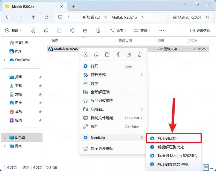 1.下载完成后,鼠标右击【Matlab R2024b】压缩包,选择【解压至此处】