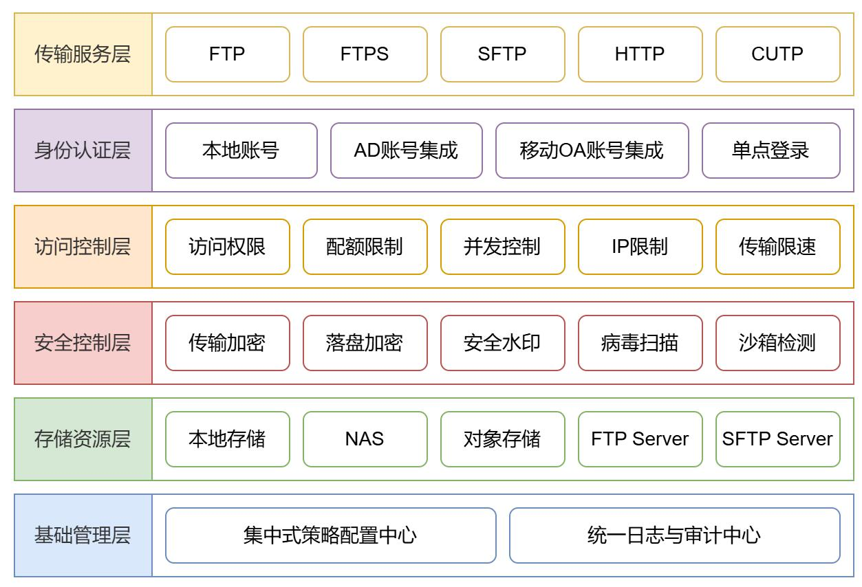 - 多存储集中传输服务:将多个NAS、FTP、对象存储等设备作为后端存储,统一对外提供文件传输服务。