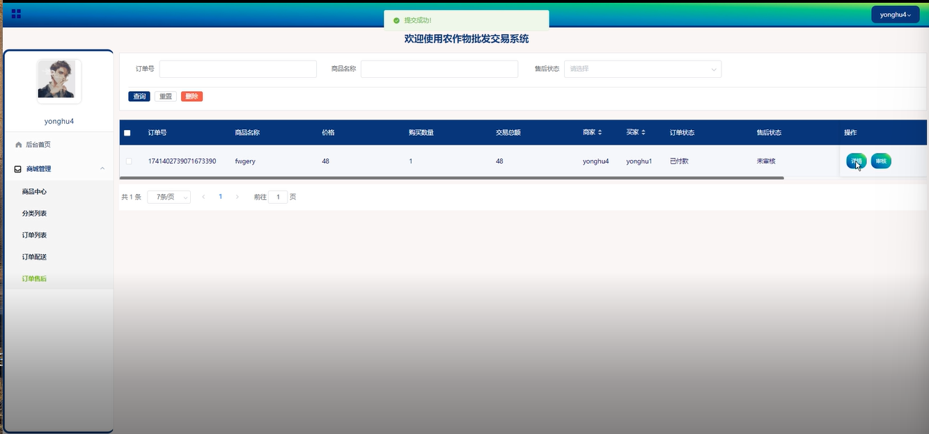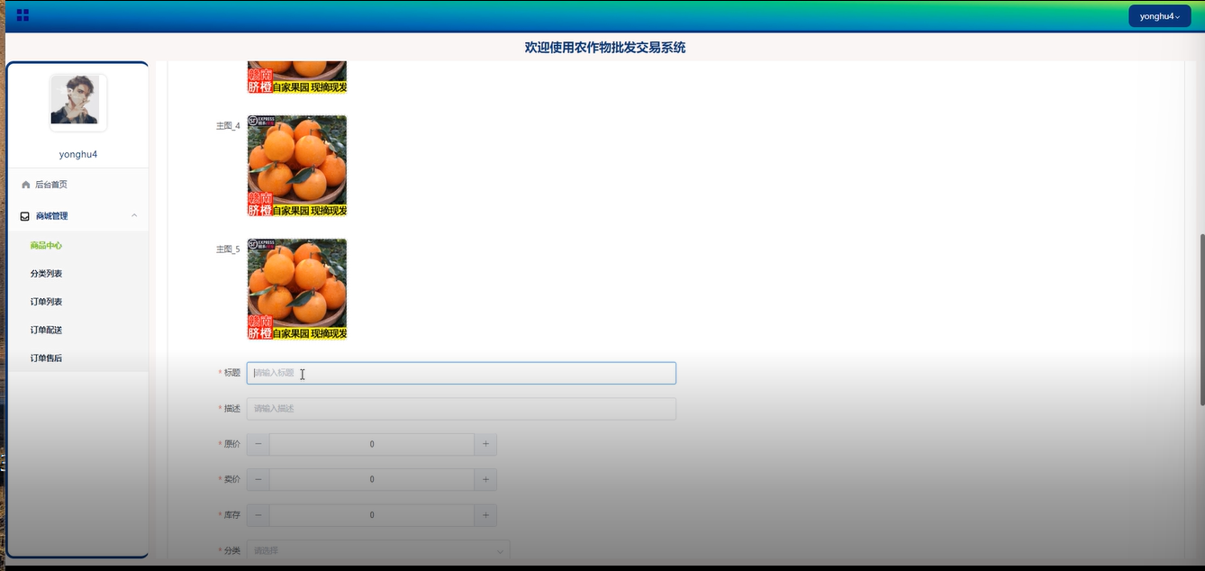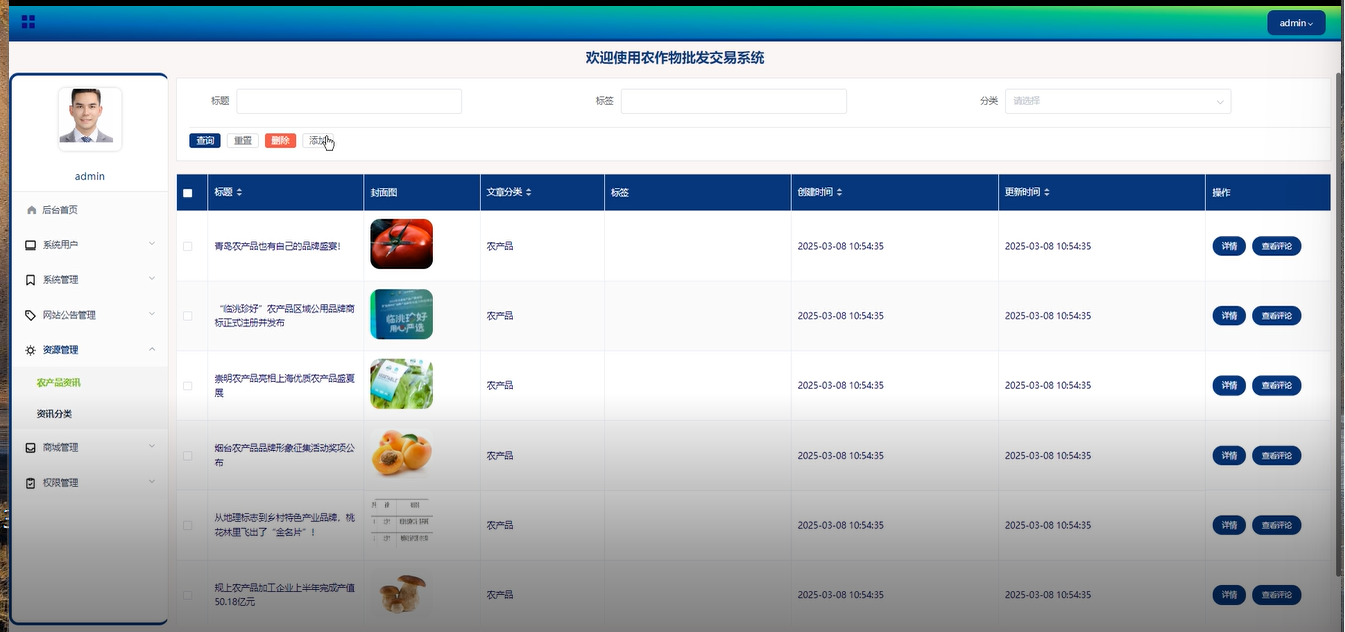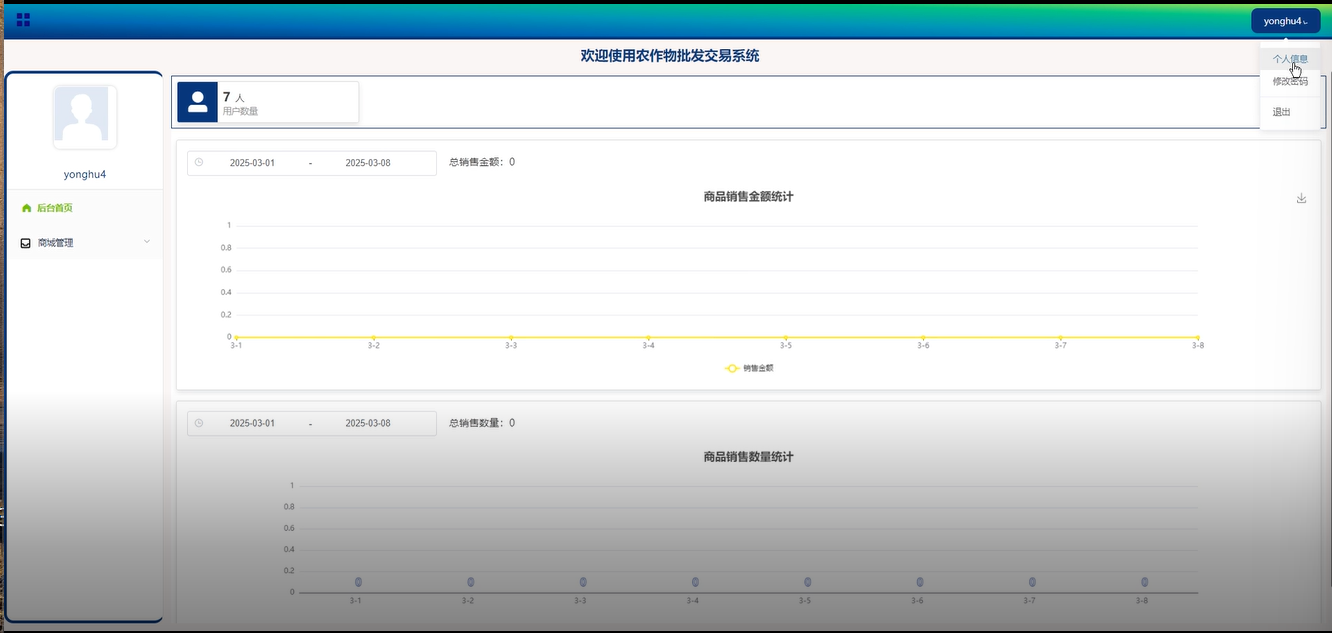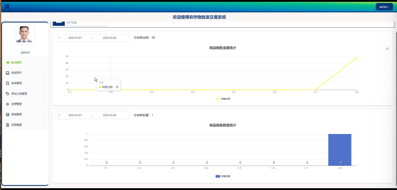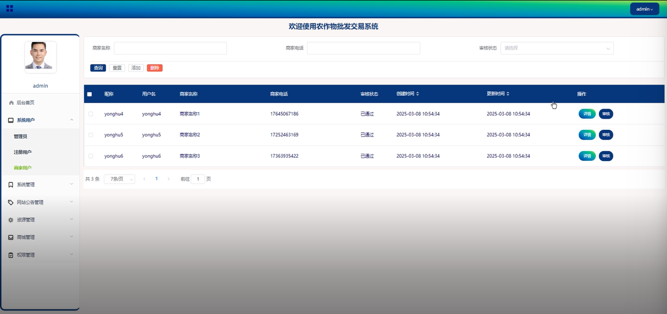 Through this system, users can conveniently and quickly purchase and trade agricultural products, merchants can efficiently manage goods and orders, and administrators can comprehensively grasp the operation status of the platform, ensuring the normal operation of the platform and effective management of resources. The implementation of the system not only improves the efficiency of wholesale trading of agricultural products, but also optimizes the user experience during the trading process, providing strong support for the digital transformation of the agricultural product industry.