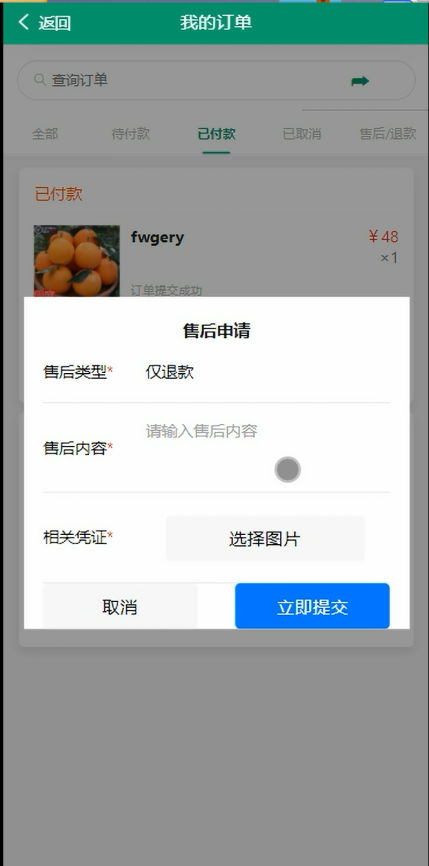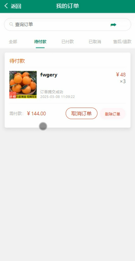 点击系统导航栏"我的",用户可以在此修改个人资料、查看和管理订单、新增和修改收货地址、查看订单的配送进度、查看收藏的商品、管理评论等。我的订单模块分为待付款、已付款、已取消、售后/退款等不同状态,方便用户清晰了解订单情况。购物车界面如下图5-7所示。我的订单界面如下图5-8所示。新增收货地址界面如下图5-9所示。售后申请界面如下图5-10所示。订单配送列表界面如下图5-11所示。
