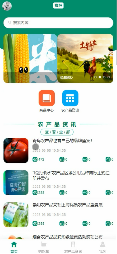 首页是系统的主界面,展示平台的核心内容,包括轮播图、农产品资讯等,用户可以通过首页快速访问各个功能模块,还可以根据关键词搜索相关内容,首页界面如下图所示。