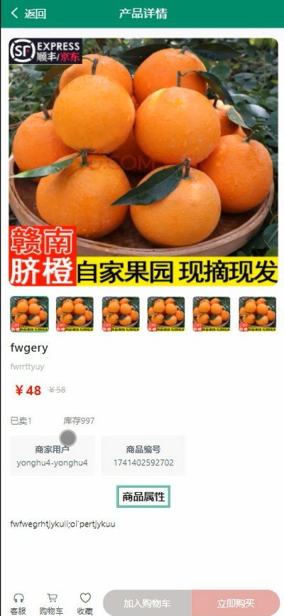 用户点击首页"商品中心"按钮,会进入产品展示列表,支持通过产品名称进行搜索和筛选产品分类,用户点击可查看产品详情,包括名称、价格、库存、图片、详细描述等,用户可以进行加入购物车、立即购买、、咨询客服、评论、收藏等操作,点击"加入购物车",用户可以将选中的产品添加到购物车,方便统一结算,并可在购物车中修改商品数量或删除商品。点击"立即购买"可以跳转到订单页面,用户可以选择支付。产品展示列表界面如下图5-5所示。产品详情界面如下图5-6所示。