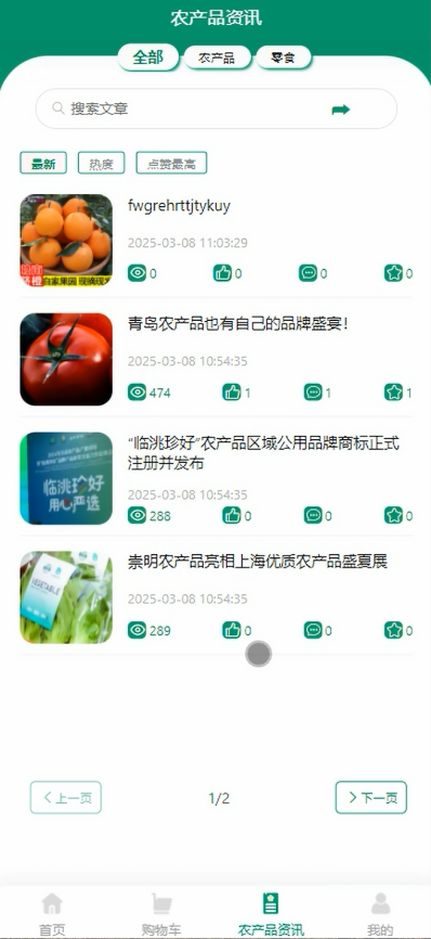 点击系统导航栏上的"农产品资讯"菜单按钮,将进入农产品资讯列表,用户可以查看系统发布的所有农产品资讯内容。点击某农产品资讯后进入详情页,可以查看该资讯的详细内容,用户可以点赞、收藏、评论等。农产品资讯页面如图5-4所示。